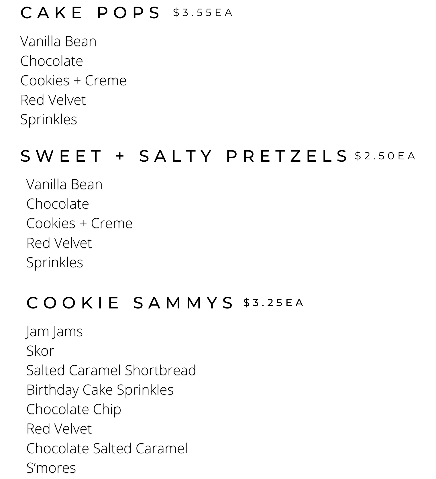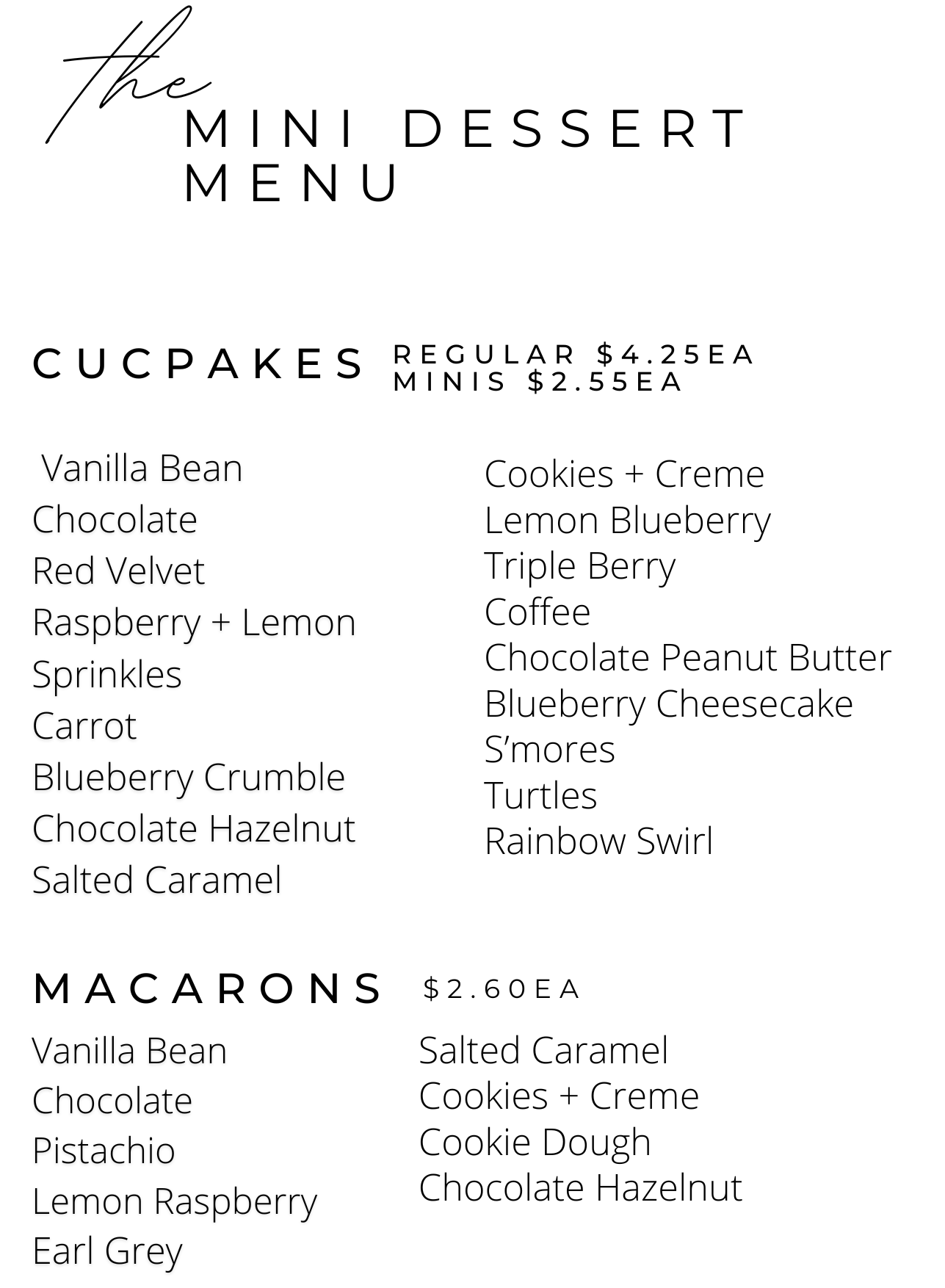 *Gluten Friendly, Dairy Free + Vegan options are available for select mini desserts, however, please note the bakeshoppe is not free of these allergens so cross contamination can occur*